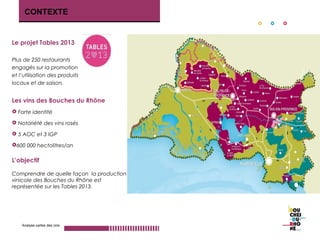 Le projet Tables 2013 mobilise plus de 250 restaurants pour promouvoir les produits locaux et de saison, avec une analyse des cartes des vins montrant que 14,6% des références sont des vins des Bouches-du-Rhône. Les restaurants présentent un comportement différent selon le type de cuisine, favorisant les vins locaux dans la cuisine régionale. Tous les vins AOC et IGP des Bouches-du-Rhône sont représentés, avec une forte prédominance des vins des vignerons indépendants.
