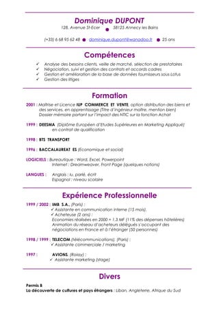 Dominique Dupont, 25 ans, possède des compétences en analyse des besoins clients, négociation et gestion de contrats, ainsi qu'une formation en commerce et vente avec une spécialisation en marketing. Elle a obtenu une expérience professionnelle significative en tant qu'acheteuse et assistante en communication au sein d'IMB S.A. et a travaillé dans le secteur des télécommunications. Elle parle français, anglais et a des notions d'espagnol, tout en montrant un intérêt pour la découverte de cultures et le sport.