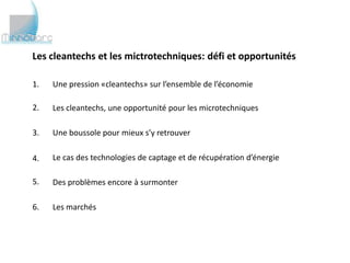 Le document traite des cleantechs comme une pression croissante sur l'économie et une opportunité pour le secteur des microtechniques, qui doit évoluer face aux réglementations écologiques. Il met en avant plusieurs domaines d'application pour les cleantechs, notamment la récupération d'énergie, le transport et l'efficacité énergétique, tout en soulignant les défis et l'importance de l'innovation. Enfin, il aborde la nécessité de nouveaux partenariats et modèles d'affaires pour réussir la transition vers un avenir plus 'clean'.