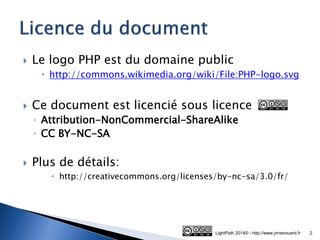 Le document traite de PHP, un langage de programmation utilisé pour le développement de sites web dynamiques, en abordant son architecture (client/serveur), son histoire, et ses spécificités comme l'interprétation par le moteur Zend. PHP est considéré comme un langage libre, respectant les quatre libertés essentielles pour l'utilisateur et le développeur. Il est également souligné que la syntaxe de PHP a évolué depuis sa création en 1995, avec plusieurs versions majeures publiées jusqu'en 2014.