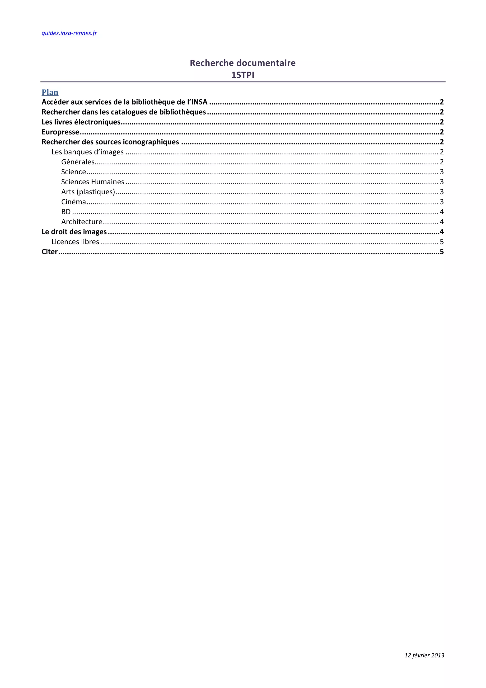 Le document présente un guide détaillé sur la recherche documentaire à la bibliothèque de l'INSA de Rennes, incluant des informations sur l'accès aux catalogues, les livres électroniques, et des sources iconographiques. Il offre également un aperçu des ressources disponibles dans divers domaines tels que la science, les arts plastiques, le cinéma et les bandes dessinées. Enfin, il aborde les droits d'usage des images et la manière de les citer correctement.