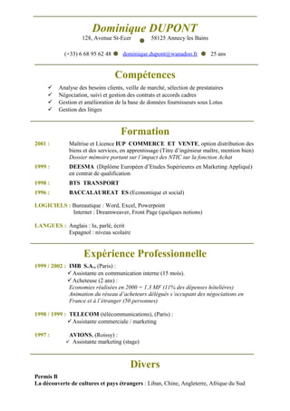 Dominique Dupont, 25 ans, possède des compétences en analyse des besoins clients, négociation et gestion de contrats, ainsi qu'en amélioration de bases de données fournisseurs. Titulaire d'une maîtrise en commerce et vente, il a travaillé dans les achats et la communication au sein de plusieurs entreprises. Dominique parle anglais et a des notions d'espagnol, et a un intérêt pour la découverte de cultures diverses.