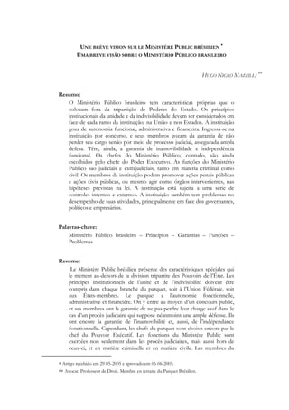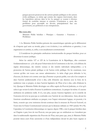 Le ministère public brésilien se distingue par son autonomie fonctionnelle, administrative et financière, et est régi par les principes d'unité et d'indivisibilité, bien qu'il existe plusieurs branches autonomes. Les membres sont recrutés par concours et bénéficient de garanties telles que l'inamovibilité et l'indépendance fonctionnelle, mais les chefs sont toujours nommés par le pouvoir exécutif, ce qui peut créer des problèmes d'influence politique. Ses fonctions incluent la promotion d'actions pénales et civiles, avec des tâches de contrôle sur divers aspects de la société et des institutions.