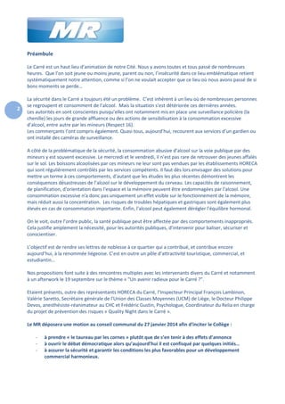 Le document présente dix propositions visant à améliorer la sécurité et à prévenir les comportements nuisibles liés à la consommation d'alcool dans le quartier du carré à Liège, où l'insécurité et la consommation excessive par des mineurs sont préoccupantes. Parmi les propositions figurent l'interdiction de consommer de l'alcool en bouteilles en verre dans certaines zones, des mesures de surveillance, ainsi que des régulations sur la vente d'alcool dans les commerces de nuit. L'objectif est d'assurer un environnement sain et sécuritaire tout en renforçant l'attractivité commerciale du quartier.