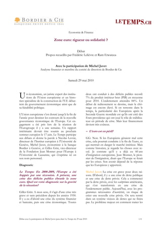 Le document présente un débat sur la situation économique de la zone euro, abordant les enjeux liés à la dette publique et privée, ainsi que les défis de gouvernance économique. Les participants soulignent la gravité de la crise actuelle, comparée à des événements historiques, et discutent des différents modèles économiques. Une pression est exercée sur les dirigeants européens pour qu'ils adoptent des politiques crédibles afin d'assurer la stabilité de l'euro et éviter une nouvelle crise de confiance.