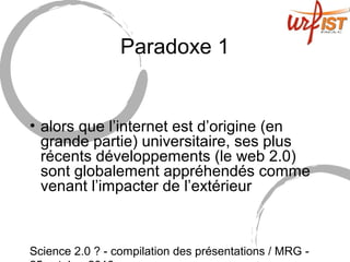 Le document aborde le concept de Science 2.0, soulignant les paradoxes liés à l'adoption inégale des outils numériques dans le milieu académique et la crise des pratiques de communication scientifique. Il met en évidence les défis rencontrés par les chercheurs et les bibliothèques face à des attentes contradictoires et le besoin de formation et de soutien institutionnel. En fin de compte, Science 2.0 est présenté comme une problématique plutôt qu'un paradigme fixe, nécessitant une adaptation des pratiques informationnelles aux nouvelles réalités numériques.