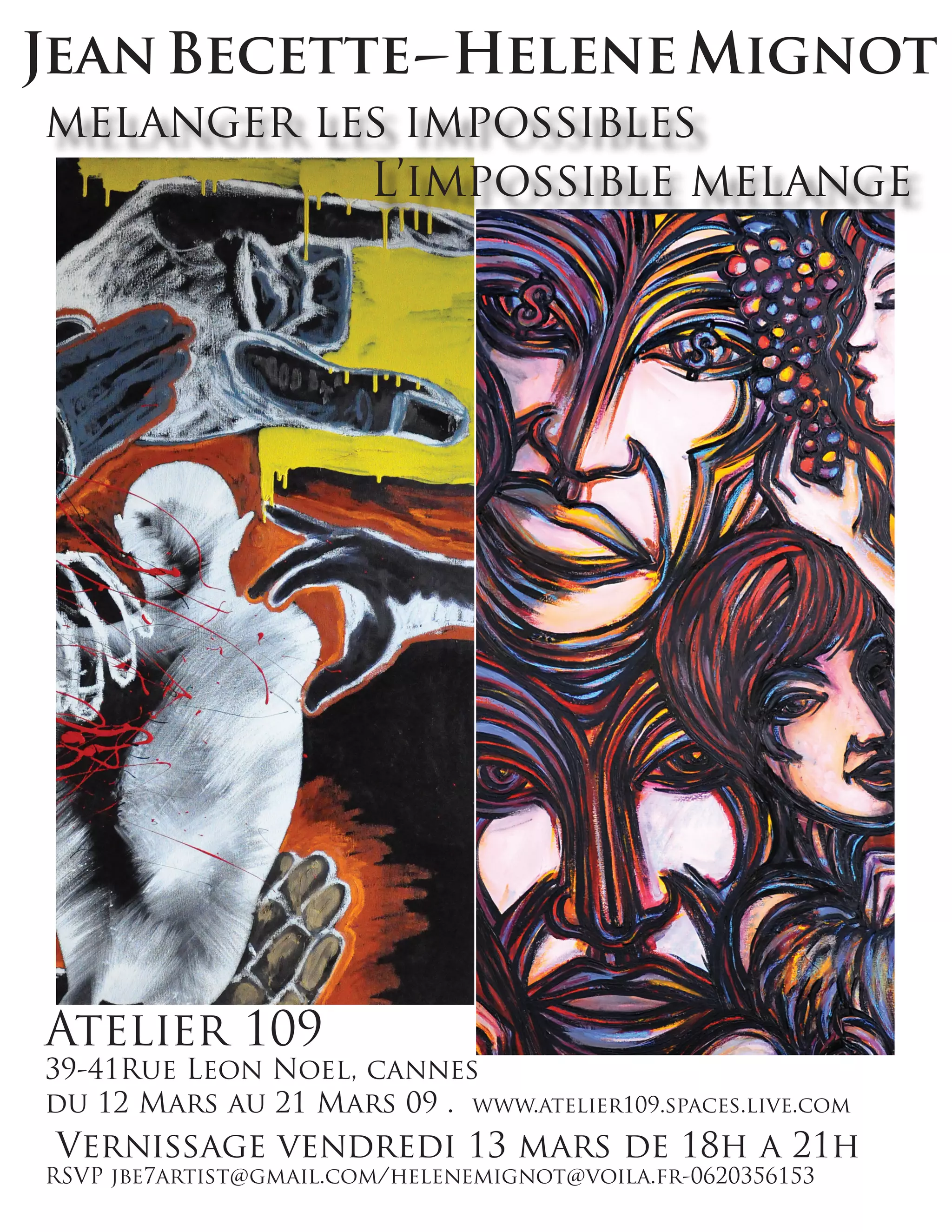L'atelier 109 à Cannes présente l'exposition 'melanger les impossibles' du 12 au 21 mars 2009, avec un vernissage le 13 mars de 18h à 21h. Les intéressés peuvent RSVP par email ou téléphone. Le projet est dirigé par Jean Becette et Hélène Mignot.