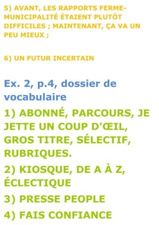 Le document traite de l'organisation d'une association qui promeut des rencontres politiques et des propositions culturelles, tout en mettant l'accent sur des projets communautaires tels qu'un verger et un théâtre. Il évoque également des préoccupations concernant les relations municipales et le secteur académique, ainsi qu'un avenir incertain. En outre, il présente un dossier de vocabulaire lié aux médias et à la presse.