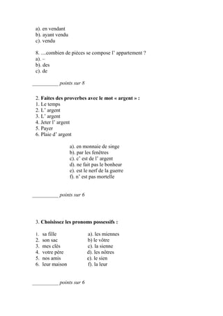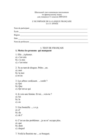 Le document présente un test de français pour les élèves de 11e année, incluant des exercices sur les pronoms, des proverbes et une compréhension écrite d'un récit. Ce récit décrit une aventure d'un officier de Napoléon en Calabre, abordant des thèmes de danger et d'incompréhension culturelle. Enfin, il contient des critères de correction pour l'expression écrite et les réponses aux questions posées.