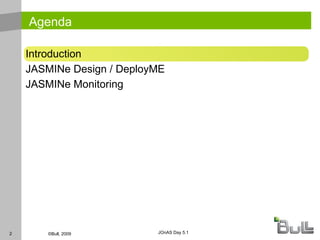 Le document présente l'agenda d'une session sur les outils Jasmine pour la conception, le déploiement et la surveillance d'architectures middleware distribuées. Il aborde les cibles actuelles en Java EE et virtualisées, ainsi que les futures plates-formes SOA et cloud computing. Les outils Jasmine incluent des fonctionnalités pour la supervision en temps réel, l'analyse post-mortem, et des actions automatisées via divers systèmes de notification.