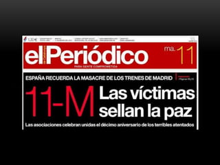 Le document exprime la douleur et la souffrance des victimes de l'attentat du 11 mars à travers des témoignages poignants. Plusieurs voix se font entendre, allant des survivants aux proches des victimes, évoquant des thèmes de perte, de tristesse et de désir de paix. Ces récits soulignent l'impact dévastateur de la violence terroriste sur les vies humaines et la quête de réponses face à l'injustice.