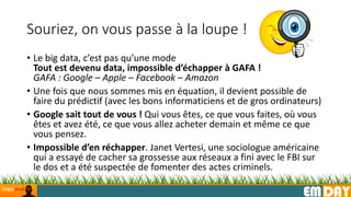 Le document traite de l'importance du big data et de la data quality, illustrant comment les entreprises comme Google collectent et analysent des données personnelles pour prédire les comportements des utilisateurs. Il souligne la nécessité d'avoir des données propres et bien structurées pour tirer parti de ces analyses. L'exemple de Janet Vertesi montre les risques associés à la tentative de cacher des informations personnelles face à la surveillance des grandes entreprises.