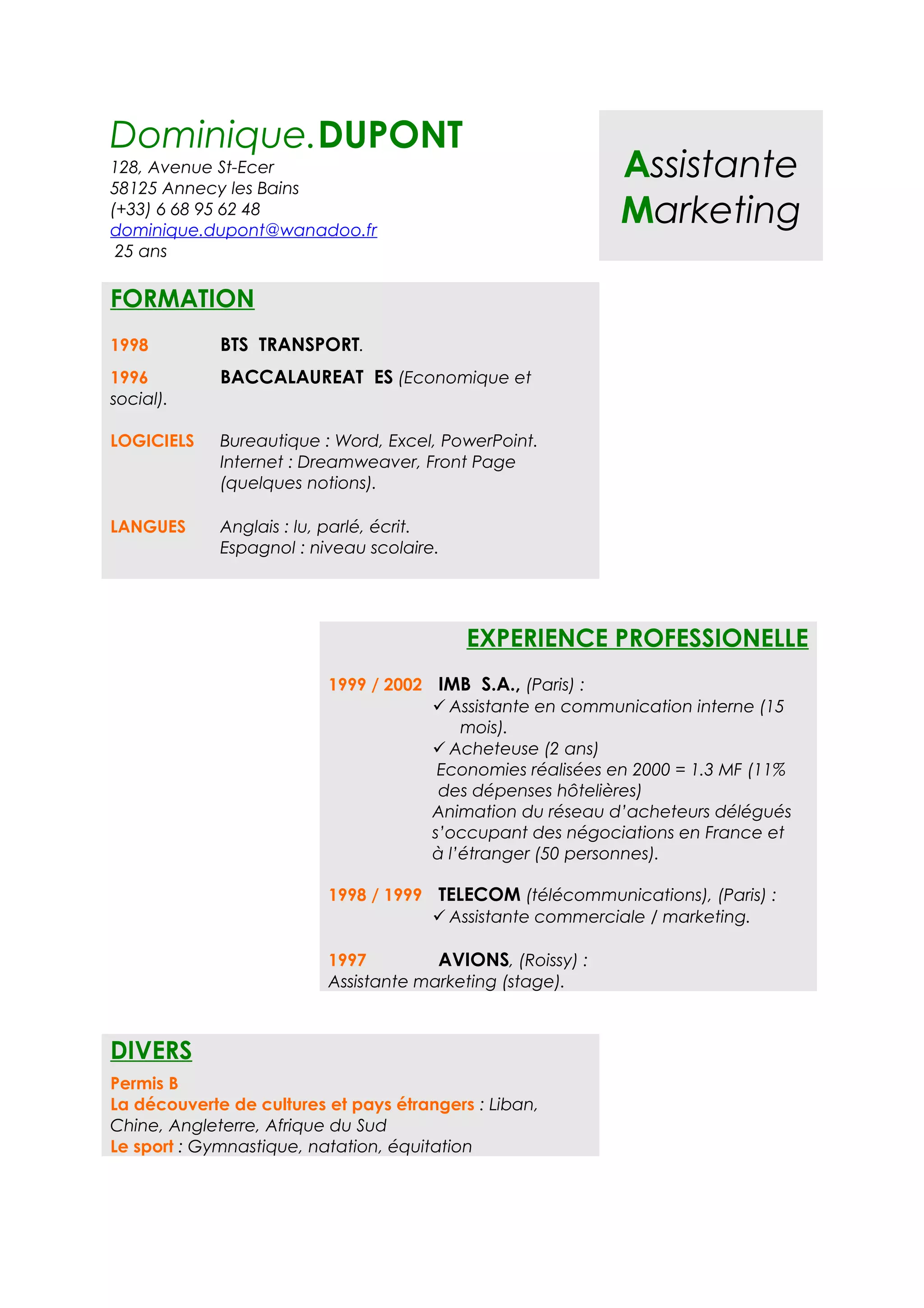 Dominique Dupont est une assistante marketing de 25 ans, titulaire d'un BTS transport et d'un baccalauréat ES. Elle a de l'expérience en communication interne et en achats, ayant travaillé pour IMB S.A. et Telecom à Paris. Dominique parle anglais couramment et espagnol à un niveau scolaire, et possède des compétences en logiciels bureautiques et web.