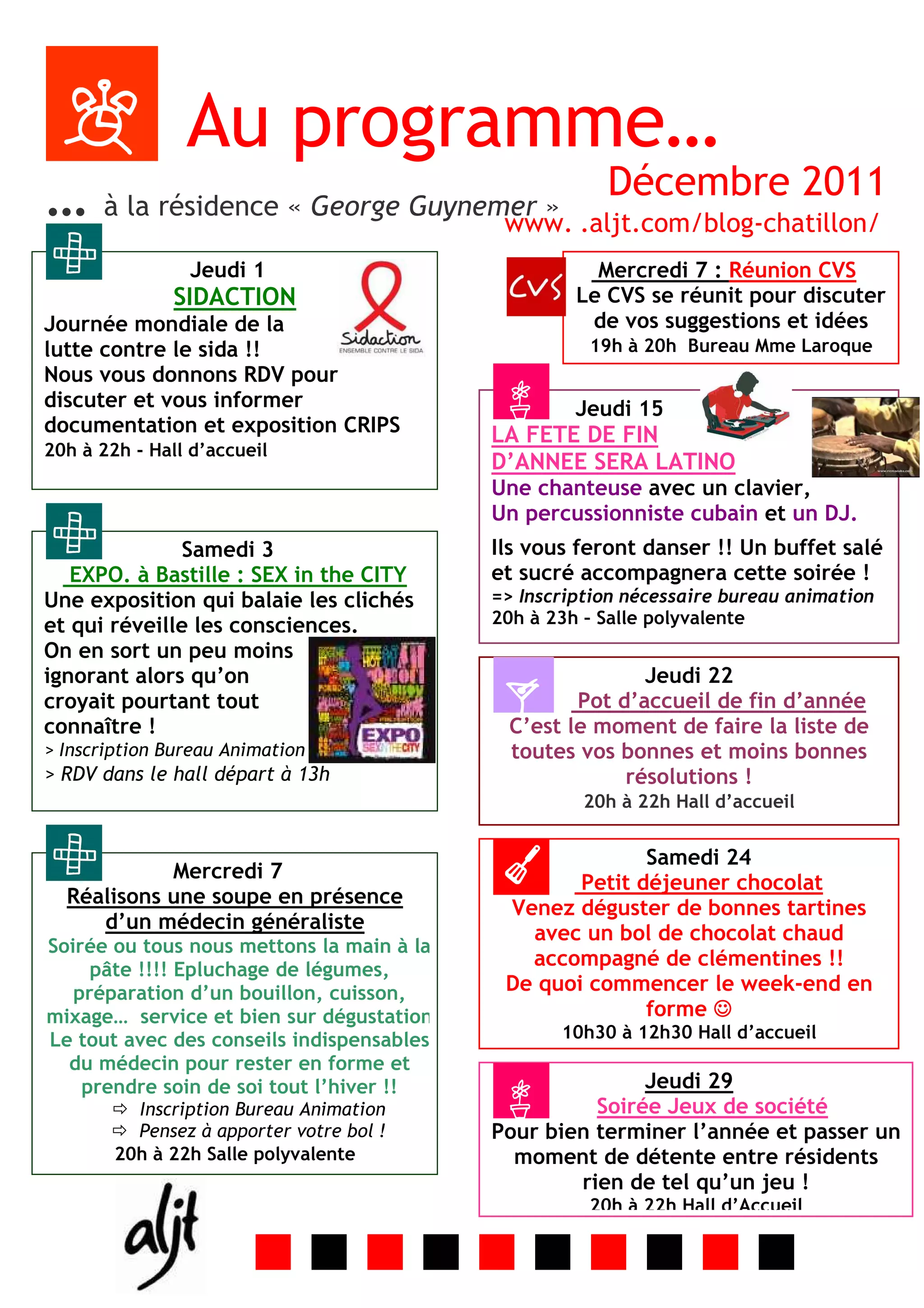 Le document détaille le programme d'activités de décembre 2011 à la résidence George Guynemer, incluant des réunions sur la lutte contre le sida, des soirées thématiques et des activités culinaires. Une exposition sur les clichés liés au sexe est également prévue, ainsi que des moments de détente autour de jeux de société. Les événements incluent des inscriptions préalables et visent à favoriser les échanges et la convivialité entre résidents.