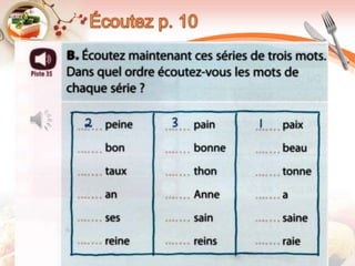 #13 2 Quelques suggestions Listen to each sentence and write the number near the drawing of the food mentioned.1. Est-ce que vous savez comment préparer les champignons?2. J’ai lu dans le journal que manger de l’ail très souvent était une très bonne chose.3. Malik a besoin d’acheter de belles tomates pour préparer le déjeuner.4. Pour maigrir, mangez plus de haricots verts et moins de gâteaux!5. Cet enfant difficile a réussi à finir toutes ses carottes. 6. En Italie, il y a beaucoup de spécialités faites avec des poivrons.7. Tu sais, autrefois, il y avait de la soupe à l’oignon à la cantine une fois par mois!8. Lulu réfléchissait à ce qu’elle allait cuisiner avec les pommes de terre.