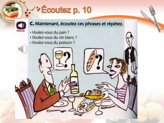 #8 3 Au restaurant You will hear a couple ordering food ina restaurant. Write the items they order in the appropriatecategory.SERVEUR Bonjour, Mademoiselle, Monsieur. Vous avezchoisi?LÉA Pour commencer, je vais prendre les fruits de mer.THÉO Et moi, le pâté de campagne.SERVEUR Très bien, et ensuite Mademoiselle?LÉA Ensuite, je vais prendre le poisson du jour avec du rizet des haricots verts.THÉO Et moi, je prends le poulet avec des frites.SERVEUR Et pour fi nir, du fromage?LÉA Non, aujourd’hui j’ai envie d’un dessert. Un éclair aucafé, s’il vous plaît.THÉO Et moi, euh… une glace au chocolat, s’il vousplaît!SERVEUR Et comme boisson?LÉA Une eau minérale…THÉO Et un verre de vin rouge, s’il vous plaît.