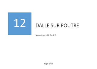 Le document traite des différents types de dalles portées sur poutres et de leur estimation d'épaisseur, notamment pour les bâtiments et parkings. Une méthode d'analyse structurale est présentée, comprenant des techniques telles que l'analyse linéaire élastique et la méthode de rupture de Johansen, ainsi que des règles pour le dimensionnement des armatures. Il couvre également divers calculs liés à la résistance des dalles et à l'armature des pièces en béton armé.