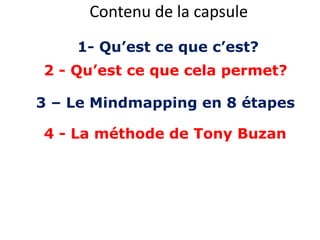 Le mindmapping, ou carte heuristique, est une méthode visuelle pour organiser des idées et représenter le cheminement de la pensée. Elle facilite la prise de notes, la préparation d'exposés, le brainstorming et l'apprentissage en structurant et clarifiant des concepts. La méthode de Tony Buzan propose des étapes précises pour créer une carte mentale efficace, en utilisant des couleurs, des images et une organisation radiale.