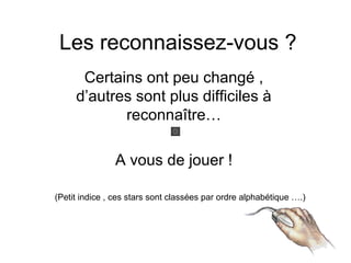 Le document présente une liste de célébrités, classées par ordre alphabétique, comprenant des acteurs, chanteurs et politiciens de différentes nationalités. Certaines personnalités mentionnées sont décédées tandis que d'autres sont encore en vie. L'auteur invite le lecteur à identifier ces stars à travers le texte.