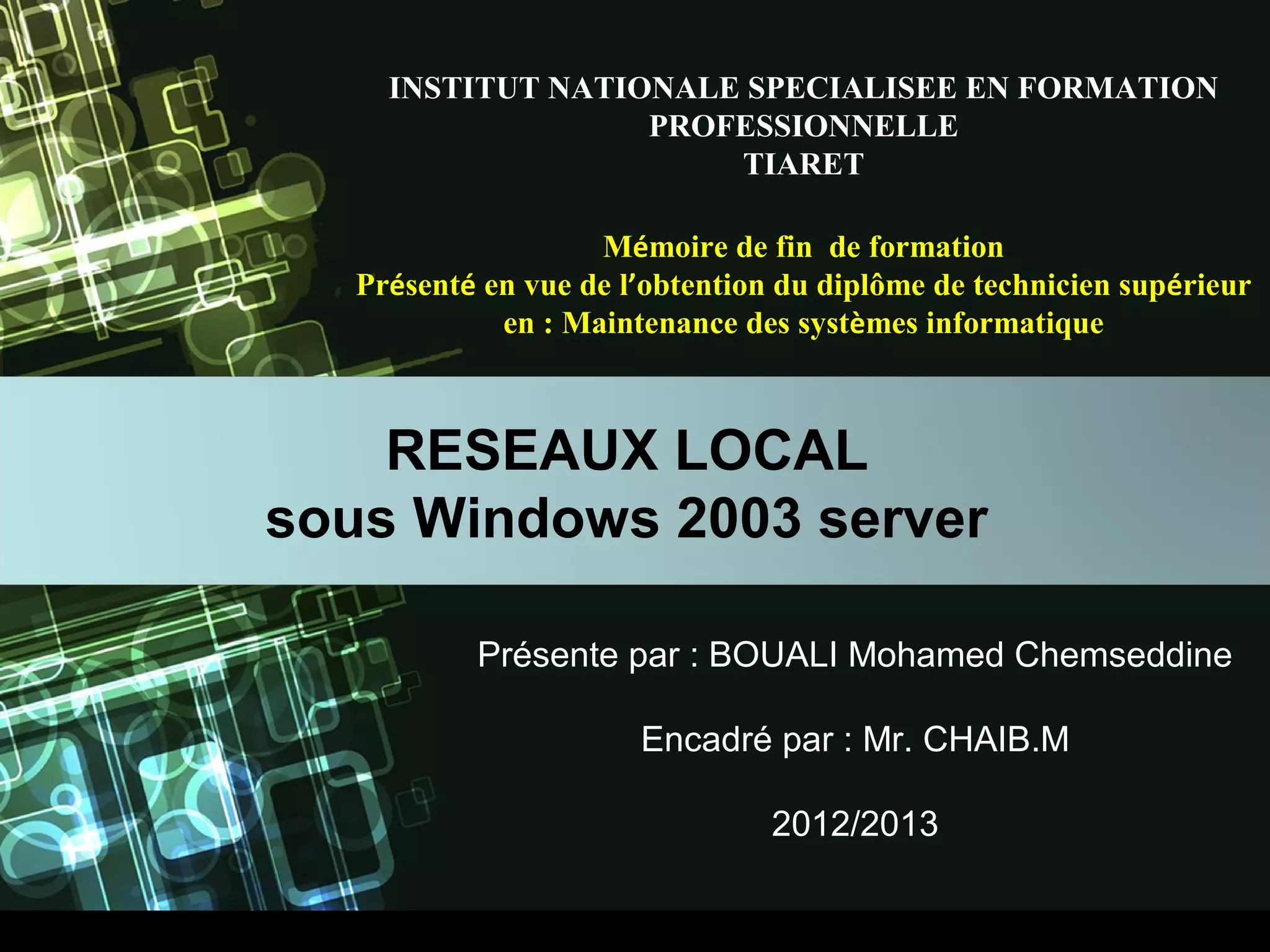 Le document traite de la gestion des réseaux informatiques sous Windows 2003 Server, en mettant l'accent sur la sécurité et l'organisation des réseaux. Il aborde les différentes topologies, les équipements d'interconnexion et les protocoles d'accès utilisés dans les réseaux locaux. Enfin, l'auteur partage son expérience de formation et l'importance de cette étude pour sa carrière professionnelle.