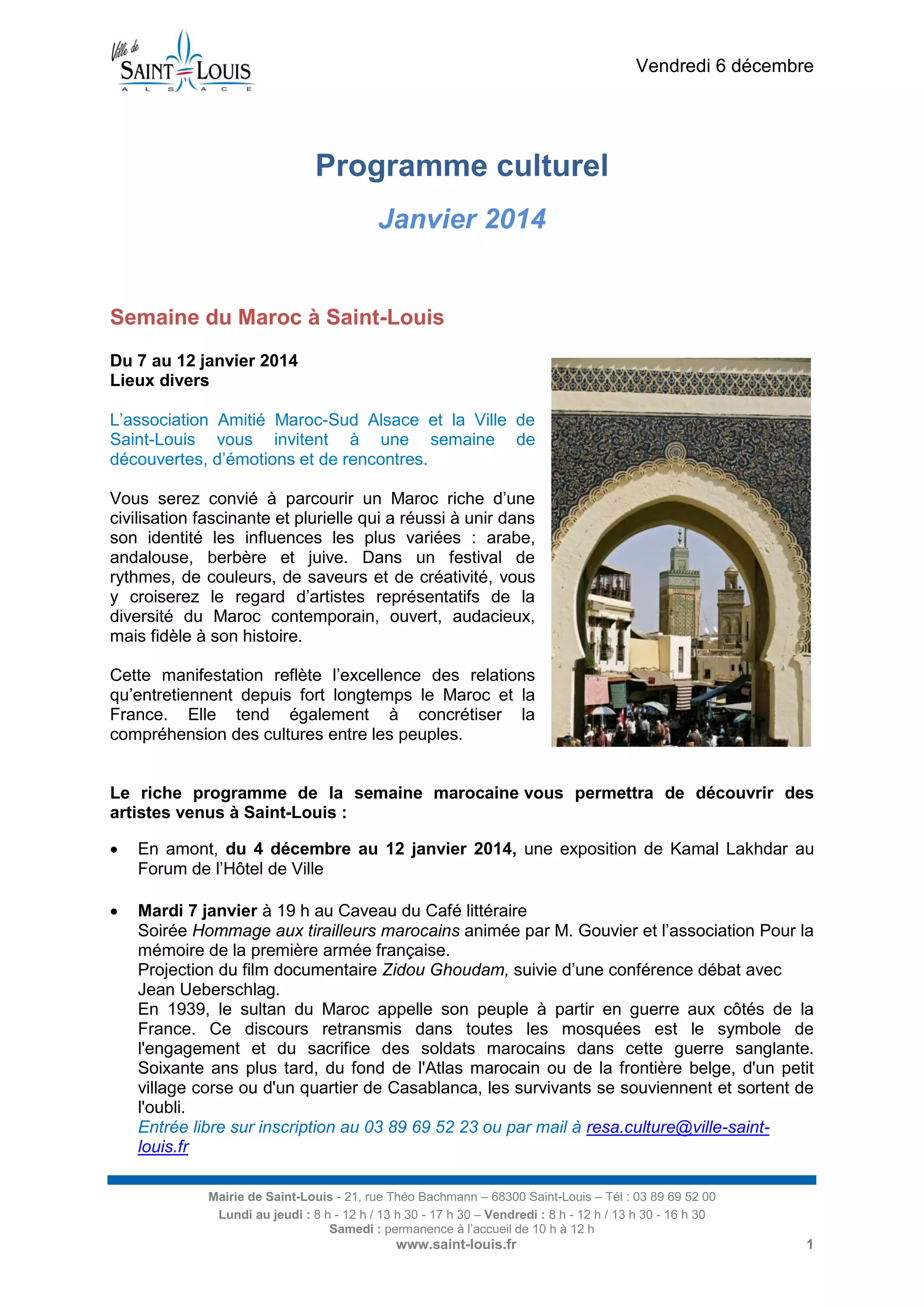 La semaine du Maroc à Saint-Louis, prévue du 7 au 12 janvier 2014, propose une série d'événements culturels pour célébrer la richesse de la civilisation marocaine, intégrant arts, histoire, et mémoire. Le programme comprend des expositions, des projections de films, des concerts et des conférences, visant à renforcer la compréhension culturelle entre le Maroc et la France. Des artistes et historiens participants animeront divers ateliers et rencontres, illustrant ainsi la diversité et l'héritage marocain.
