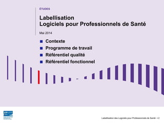 Le document présente le programme de labellisation des logiciels pour professionnels de santé, visant à améliorer la qualité et la sécurité des soins à travers une gouvernance collaborative et des compétences mutualisées. Il décrit les objectifs, les prérequis, et les domaines fonctionnels spécifiques liés à la labellisation, ainsi que les critères exigés pour assurer l'interopérabilité et la fiabilité des systèmes d'information hospitaliers. Le programme comprend une cartographie des offres et un référentiel qualité pour encadrer le déploiement des logiciels labellisés.