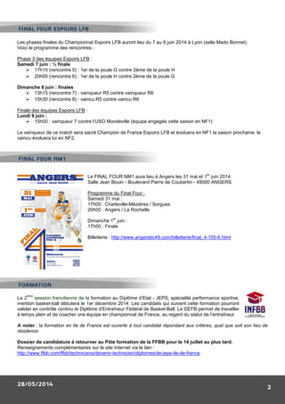 Le 17 mai 2014, Jean Siutat a été réélu président du central board de la FIBA Europe à Munich, qui a également nommé Turgay Demirel comme président pour quatre ans. Les phases finales des championnats espoirs LFB sont prévues du 7 au 9 juin 2014 à Lyon, avec des matches déterminants pour la montée des équipes. Par ailleurs, la FFBB propose des camps de basket pour jeunes et adultes durant l'été 2014.