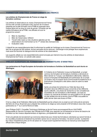 Le document présente des informations sur les licenciés du basketball en France, les financements de la taxe d'apprentissage pour le développement du sport, et divers projets de formation pour arbitres et entraîneurs. Il aborde également les prochaines sessions de formation, le comité d'organisation du tournoi de qualification olympique féminin et des événements de basketball à venir. La fédération française de basketball est active dans le soutien à l'apprentissage et à l'amélioration des compétences techniques au sein de sa structure.