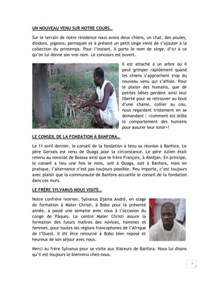 Le document décrit la vie à Banfora, Burkina Faso, en avril, avec des récoltes agricoles, un nouvel animal de compagnie, et des événements communautaires. Il relate une panne d'eau majeure qui a affecté la ville et la visite d'un nouveau responsable religieux. Il évoque également la célébration du mois de Marie et des souvenirs personnels du rédacteur, tout en soulignant l'importance de la production de coton dans la région.