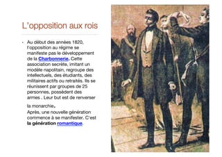 Le document aborde la France en 1831, année de publication du roman 'Notre-Dame de Paris', en mettant en lumière l'opposition politique sous le règne de Charles X, qui tente de restaurer l'influence monarchique avant la Révolution de 1789. Suite à des tensions croissantes et des modifications électorales, le roi abdique après la Révolution de 1830, menant à l'établissement de la monarchie de juillet sous Louis-Philippe Ier. En parallèle, le texte mentionne des innovations industrielles significatives de cette période, comme la machine à vapeur et la locomotive à vapeur.