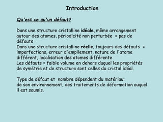 Le document traite des défauts dans les cristaux, en expliquant que ces défauts, qu'ils soient ponctuels, linéaires, plans ou volumiques, modifient les propriétés intrinsèques et extrinsèques des matériaux. Il explore les diverses causes et conséquences de ces défauts, notamment leur impact sur la stabilité et les comportements mécaniques. Enfin, il aborde la manière dont les impuretés interagissent avec la structure cristalline, affectant à la fois les propriétés optiques et la composition chimique des cristaux.