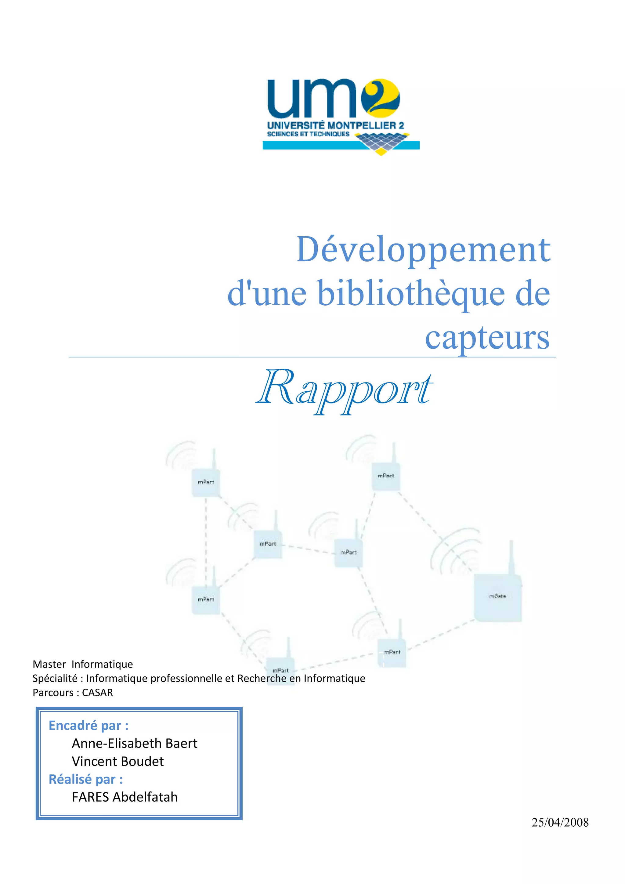 Ce document présente le développement d'une bibliothèque de capteurs en se concentrant sur les réseaux de capteurs sans fil (WSN) et leur fonctionnement. Il aborde des concepts clés tels que les algorithmes de routage, l'architecture des capteurs, la gestion de l'énergie, et propose un simulateur pour tester ces réseaux. En fin de compte, le travail vise à explorer et à résoudre les défis liés à l'acheminement de données tout en prenant en compte les contraintes énergétiques des capteurs.