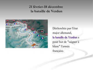 La bataille de Verdun, qui a eu lieu entre le 21 février et le 18 décembre 1916, a été déclenchée par l'état-major allemand dans le but de détruire l'armée française. Henri Barbusse, engagé volontaire en 1914 et devenu pacifiste, reçoit le prix Goncourt pour son ouvrage 'Le Feu' en 1917, qui témoigne des horreurs vécues par les soldats dans les tranchées. D'autres œuvres comme 'Les Croix de bois' de Roland Dorgelès et 'À l'ouest, rien de nouveau' d'Erich Maria Remarque sont également recommandées.