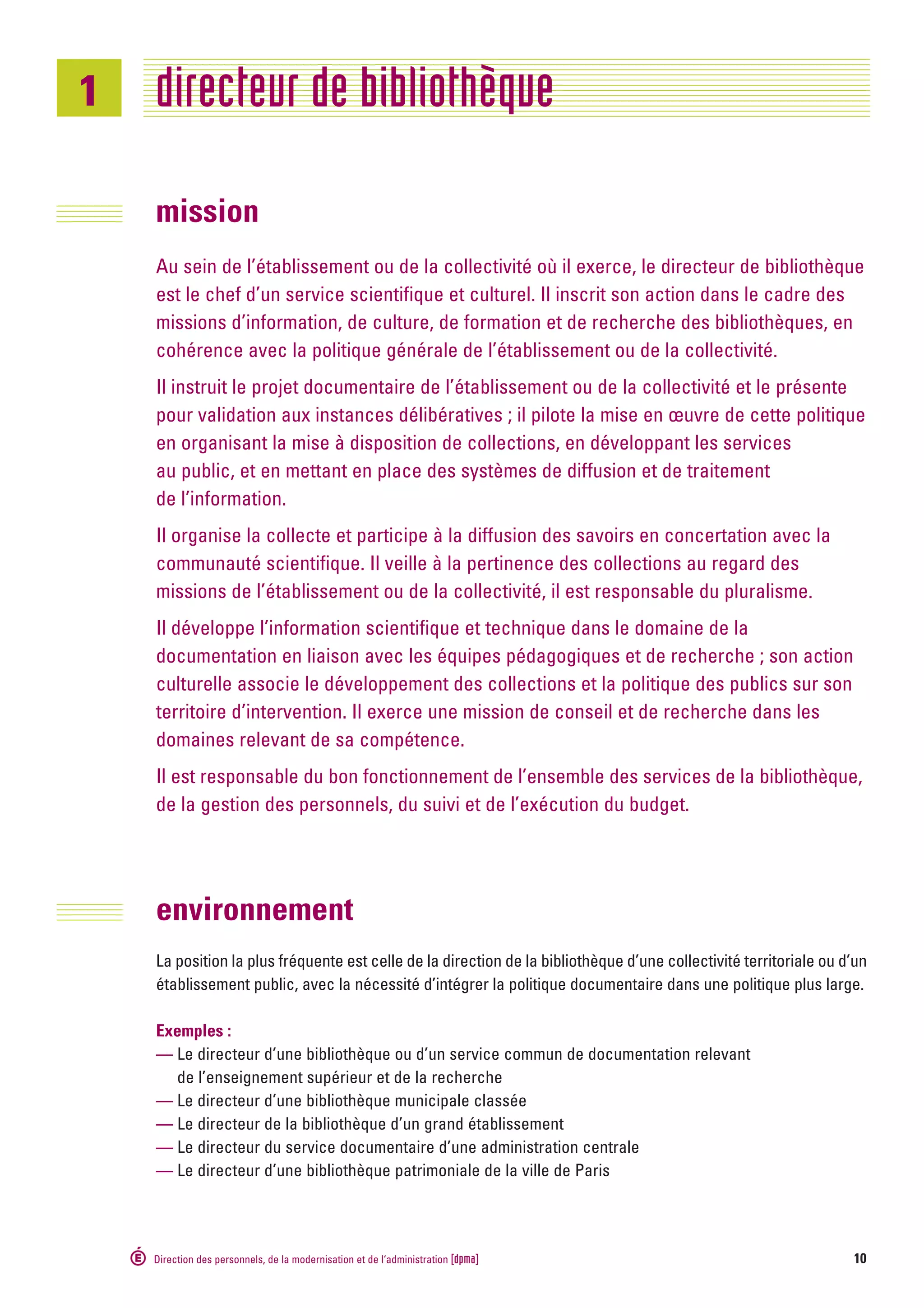 Le directeur de bibliothèque est le responsable d'un service scientifique et culturel, intégrant la mission de l'établissement dans une politique d'information, de culture et de recherche. Il élabore et met en œuvre le projet documentaire, gère les ressources humaines et le budget, et contribue à la diffusion des savoirs en lien avec la communauté scientifique. Ses activités incluent également l'évaluation et la modernisation des services, tout en assurant la sécurité et l'accessibilité des ressources pour le public.