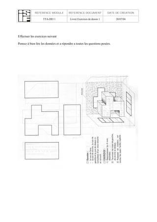 Le document est un livret d'exercices de dessin industriel, référencé comme tta-dei 1, créé le 20/07/04. Il contient des exercices d'application que les utilisateurs doivent compléter en lisant attentivement les données et en répondant à toutes les questions. Ce livret est réitérativement mentionné pour souligner son importance dans le cadre d'apprentissage des techniques de dessin.