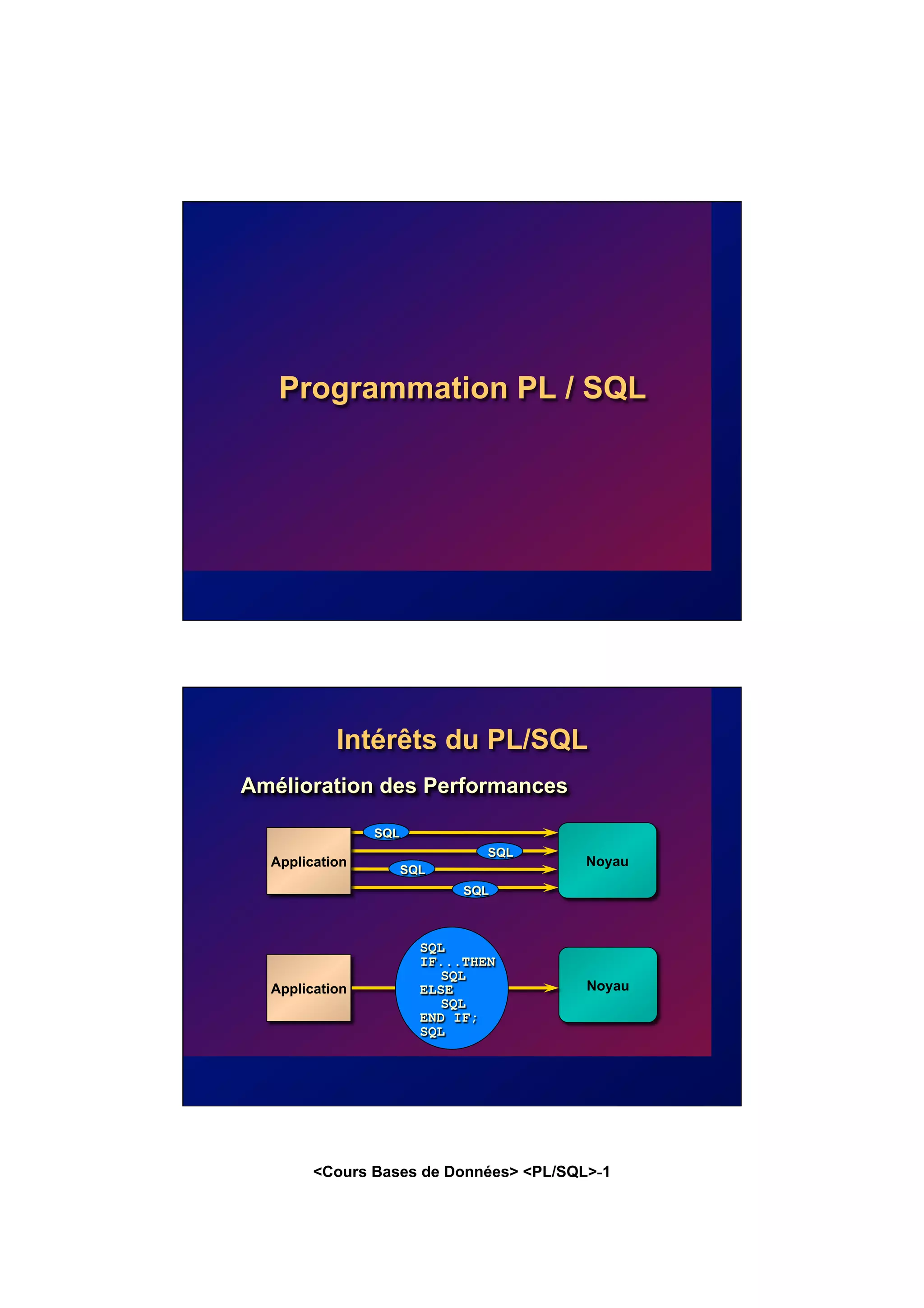 Le document est un cours sur le langage PL/SQL, présentant des concepts fondamentaux tels que la structure de bloc, la gestion des erreurs, les variables, et les types de données. Il décrit également l'utilisation de curseurs, les ordres SQL (INSERT, UPDATE, DELETE), ainsi que les structures de contrôle comme les boucles et les conditions. Enfin, il aborde les fonctionnalités avancées comme les blocs imbriqués et les types de données spéciaux, offrant ainsi une vue d'ensemble sur la programmation avec PL/SQL dans les bases de données.