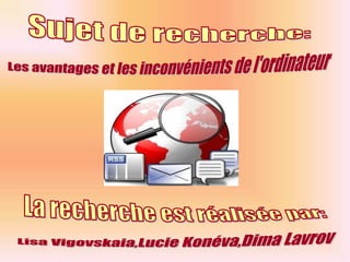 Le document examine les avantages et les inconvénients de l'ordinateur, soulignant son utilité pour la recherche rapide, l'apprentissage des langues et la communication. Cependant, il met en garde contre les risques pour la santé, comme la fatigue oculaire et l'addiction aux jeux vidéo. Il conclut en insistant sur l'importance de faire des pauses lors de l'utilisation de l'ordinateur.