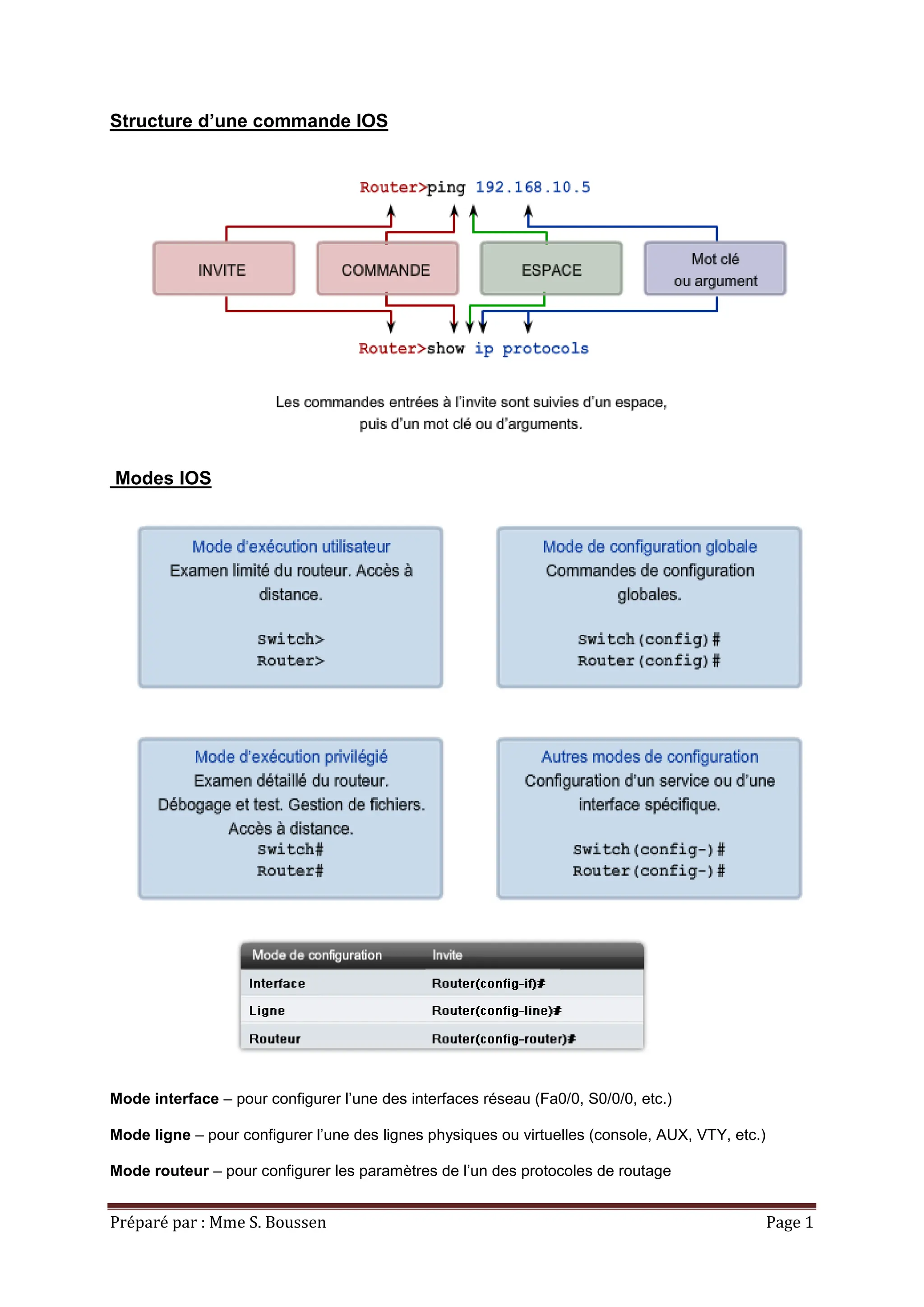 Le document détaille la structure et les commandes de configuration pour les systèmes IOS, y compris les modes tels que l'interface, la ligne et le routeur. Il présente des raccourcis utiles et des commandes de base pour naviguer et configurer les paramètres réseau. Des instructions spécifiques sur la gestion des fichiers de configuration et la configuration des interfaces sont également fournies.