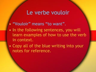Le document présente le verbe français 'vouloir' qui signifie 'to want' avec des exemples d'utilisation en contexte. Il inclut des phrases illustrant différents sujets exprimant leurs désirs alimentaires. En outre, il donne des exercices à faire sur les verbes 'vouloir', 'pouvoir' et 'devoir'.