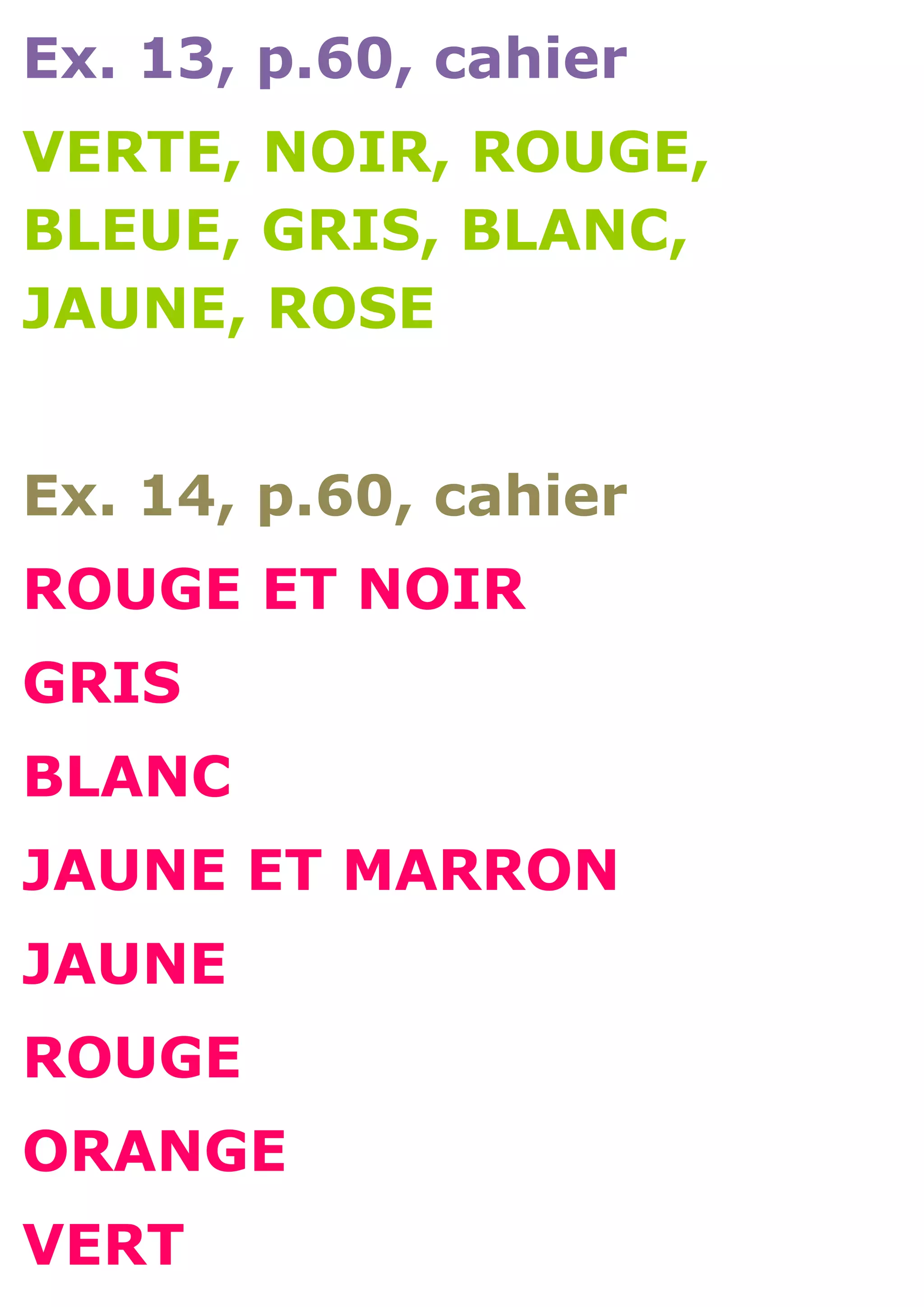 Le document présente une liste de couleurs associées à divers cahiers et pays. Il mentionne des coloris spécifiques pour l'Allemagne, la Colombie, le Gabon, la Suède, le Vietnam et la Bretagne. La liste inclut également des objets comme un film en noir et blanc, un vase et un frigo.