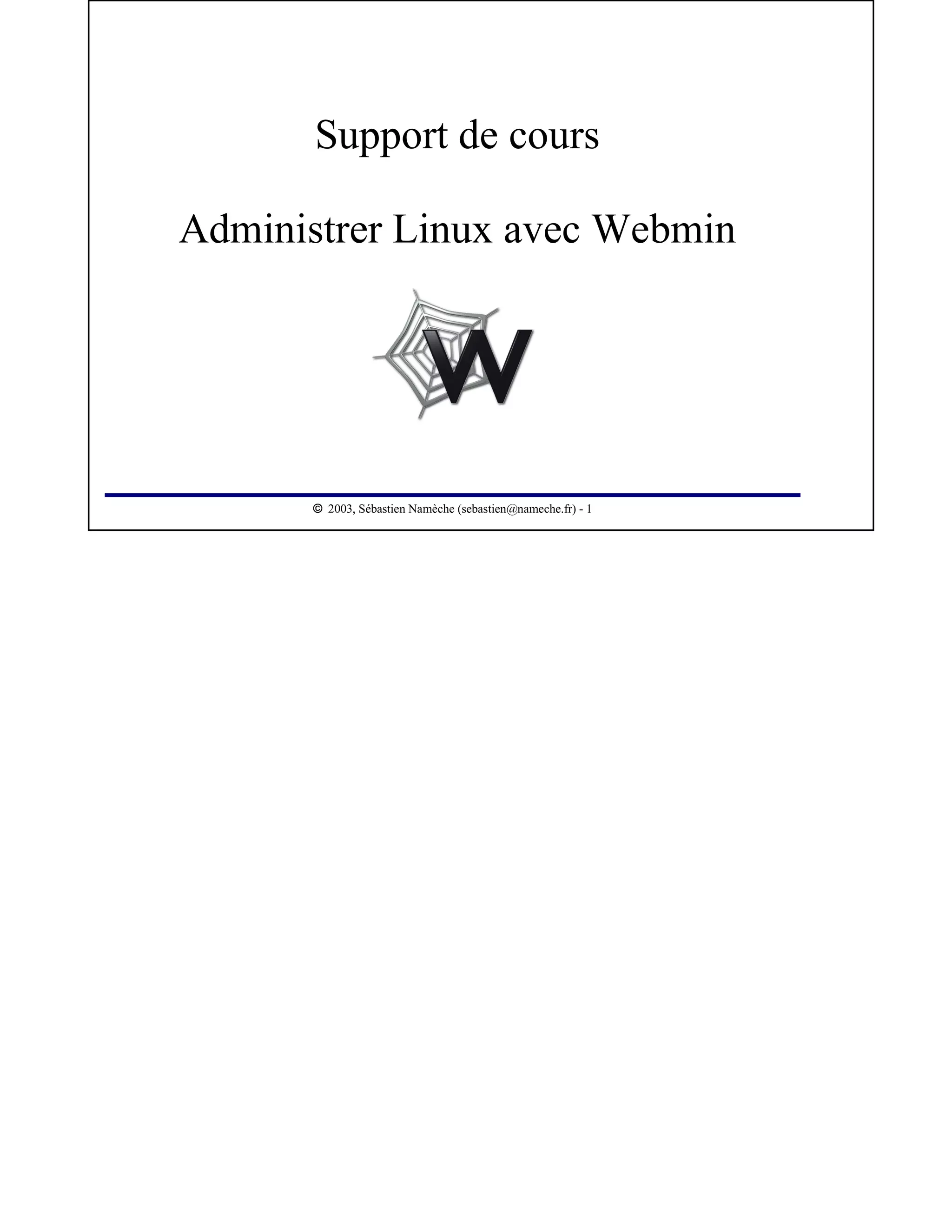 Ce document présente Webmin, une interface graphique pour l'administration à distance des systèmes Unix, permettant de surmonter des difficultés liées à l'administration classique. Il détaille les étapes d'installation et de configuration de Webmin, ainsi que ses caractéristiques et modules permettant de gérer efficacement les utilisateurs et services. La licence d'utilisation et les conditions de propagation du document sont également spécifiées.