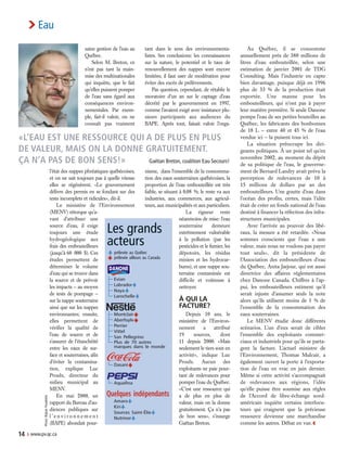 Françoise Lavoie a changé sa stratégie de distribution d'eau embouteillée face à la concurrence des multinationales, vendant désormais son produit uniquement dans des établissements haut de gamme. Bien que les sociétés comme Nestlé et Danone dominent le marché de l'eau embouteillée au Québec, des préoccupations persistent quant à l'impact environnemental de leur extraction. Les embouteilleurs profitent d'une ressource précieuse qu'ils obtiennent gratuitement, suscitant un appel à la mise en place de redevances sur l'eau.