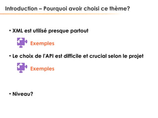 Le document présente une introduction à XML, son utilisation omniprésente, ainsi que des réflexions sur le choix des API et les contraintes liées à son utilisation dans les projets. Il explore les langages liés à XML, les avantages et inconvénients des différentes solutions, ainsi que l'intégration de XML avec Java. Enfin, il mentionne des outils et technologies comme SAX, DOM, StAX, JDOM et JAXB pour gérer et manipuler des documents XML.