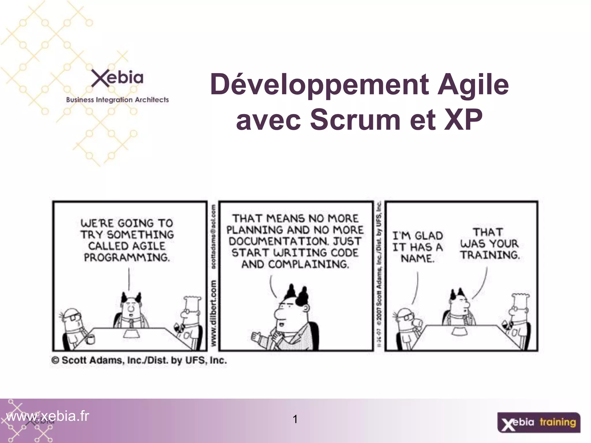 Ce document présente une formation sur le développement agile, avec un accent sur les méthodologies Scrum et Extreme Programming (XP). Il couvre les principes de l'agilité, les rôles clés dans Scrum, ainsi que les étapes de gestion de projet agile, y compris la planification et l'amélioration continue. Les avantages de l'agilité, tels que la moindre rigidité face aux changements et l'accent accru sur la collaboration, sont également abordés.