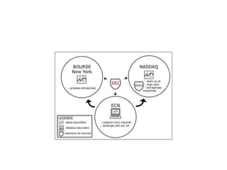 Le document traite du Nasdaq, sa création en 1971, et les conditions requises pour qu'une entreprise s'y inscrive, telles que l'enregistrement auprès de la SEC et le respect de critères financiers. Il décrit également le processus d'introduction en bourse, incluant une période de silence, la rédaction d'un prospectus et la période de blocage des actions. Enfin, il précise les horaires de session de trading sur le Nasdaq et le rôle des acteurs financiers dans le processus de cotation.