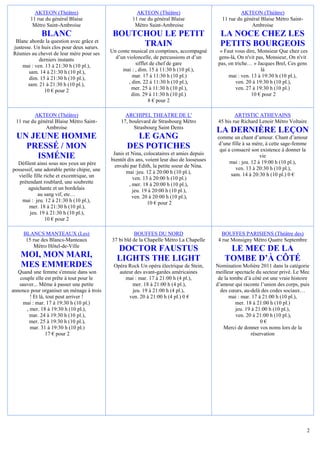 Le document détaille les informations concernant des spectacles et leurs implications financières, y compris les horaires de réservation, les tarifs de solidarité et les modalités de paiement. Plusieurs spectacles sont annoncés avec des détails sur les performances, leurs dates et les lieux. Il mentionne également les règles de participation et les responsabilités liées à l'organisation des spectacles.