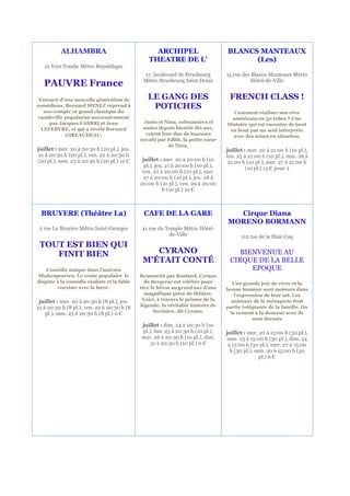 Le document fournit des informations sur divers spectacles et événements culturels se déroulant à Paris, y compris des détails sur les horaires, les prix des billets et les modalités de paiement pour la solidarité. Il mentionne également les lieux spécifiques et les comédiens impliqués dans différentes productions théâtrales. La programmation couvre plusieurs dates en juillet avec une variété d'offres et d'options de divertissement.