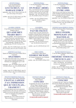 Le document présente une série de spectacles organisés dans différents théâtres à Paris, avec des informations sur les prix des billets, les horaires, et les modalités de participation financière à des œuvres de solidarité. Il met en avant des pièces variées allant de la comédie musicale au théâtre classique, proposant des soirées de divertissement pour les familles et les adultes. Des indications pratiques concernant les réservations sont également fournies.