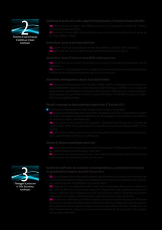 Le document présente un plan stratégique pour le développement numérique en France entre 2012 et 2020, avec 57 objectifs prioritaires visant à améliorer la compétitivité des entreprises, l'accès à internet et la lutte contre la fracture numérique. Les initiatives incluent le développement du cloud computing, l'amélioration des infrastructures de très haut débit, la numérisation des contenus culturels et l'intégration des technologies numériques dans la vie quotidienne et au sein des administrations publiques. Enfin, il propose de renforcer la sécurité, la protection des données et l'éducation numérique pour tous les citoyens.