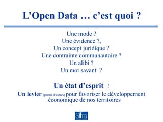 L'open data est un état d'esprit visant à favoriser le développement économique des territoires en diffusant des informations accessibles. Il repose sur un modèle financier collaboratif et une dynamique d'innovation, tout en necessitant des données de qualité. Une gestion pluridisciplinaire et une plateforme technique solide sont essentielles pour que chacun contribue et tire des bénéfices de cet écosystème.